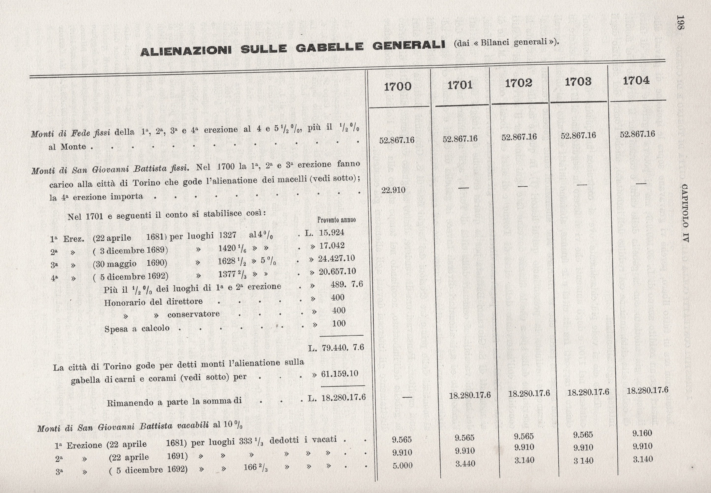 Le finanze al principio del secolo doveano già alla città di Torino 635.500 lire per censi al 5% e le aveano alienata la gabella delle carni e corami (macelli) per un reddito annuo di L. 80.000. L’alienazione era stata fatta nel 1690 per il prodotto della gabella che s’esigeva sul territorio della città e suoi borghi ed all’interesse del 5% corrispondeva ad un capitale di L. 1.645.205. Nel 1699 la città avea consentito a ridurre l’interesse al 4% e per conservarsi ciononostante il possesso dell’intiera gabella avea pagato altre L. 411.301.5; e così in tutto L. 2.056.506.5. Non tutta la somma era stata pagata in contanti, perché la cittàs’era accollato il servizio intiero delle tre prime erezioni dei monti fissi di S. Giovanni Battista e parte della quarta erezione. Comunque sia di ciò, la gabella della carne e dei corami era oramai alienata; e per quanto la cosa nuocesse alle finanze, non v’era da ricavarne altro pro[15]. Rimanevano in proprietà delle finanze, ed esigibili nel territorio di Torino, la gabella dell’imbottato e l’altra della foglietta, gabella grossa degli hosti e cinque ottavi di ducatone (cfr. p. 6). L’imbottato non era in tutto libero, perché vi gravavano sopra le ipoteche di privati alienatari per un reddito annuo di L. 39.169.9.6; ma si poteva seguire e si seguì di fatto il sistema, già adottato con la gabella delle carni e corami per il servizio dei monti, di cedere alla città, insieme col reddito dell’imbottato, anche l’onere del servizio degli interessi agli alienatari.