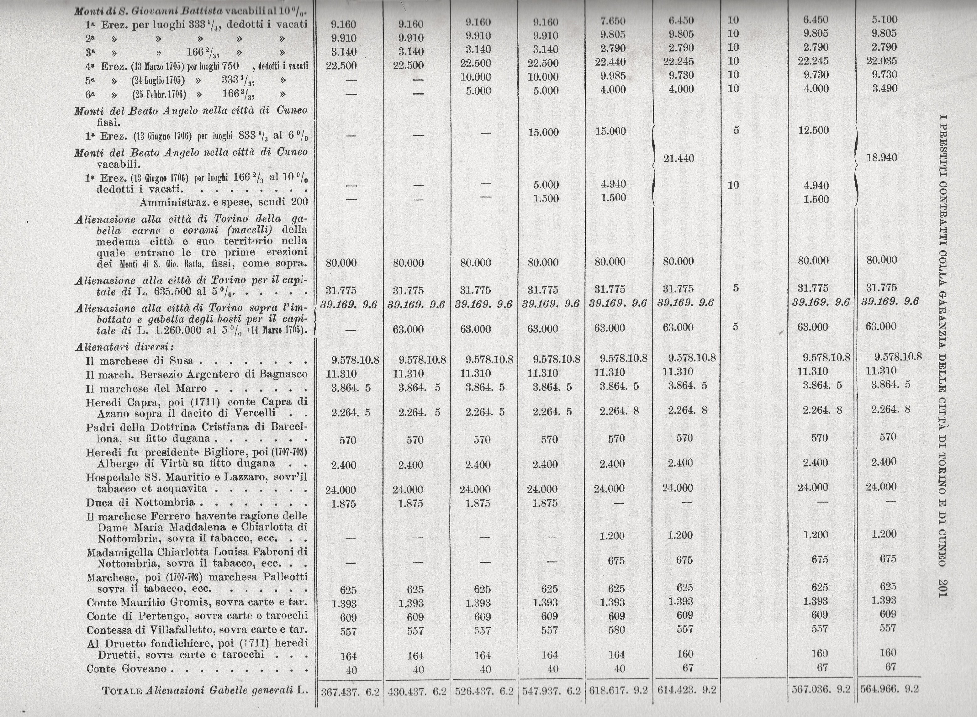 Tutto ciò si vede più chiaramente ove si costruisca un quadro delle alienazioni esistenti nel 1700 e degli aumenti che vi si fecero in seguito fino al 1713. A mettere in chiaro i rapporti fra la città e le finanze, abbiamo infatti estratto dai bilanci generali della spesa la parte che si riferisce alle alienazioni sulle gabelle generali e sistematicamente ordinata la presentiamo qui ai lettori[16]. In queste tabelle è riassunta la previsione della spesa che le finanze doveano fare ogni anno per il servizio dei prestiti conchiusi coll’intervento della cittàdi Torino e di altri enti locali, come il Monte di Fede e Pietà. Le finanze pagavano direttamente gli interessi dovuti ai montisti di fede, ai montisti di Giovanni Battista per la quarta erezione dei luoghi fissi, ai montisti dei luoghi vacabili, ai censuari della città di Torino, agli alienatari sulla gabella dell’imbottato ed agli alienatari diversi. Invece la gabella di carni e corami era stata addirittura venduta alla città di Torino, che col suo provento pagava gli interessi dovuti ai montisti delle prime tre erezioni dei luoghi fissi di S. Giovanni Battista e ad altri suoi creditori. Pensavasi ora di vendere, dietro adeguato compenso, alla città di Torino la gabella dell’imbottato, accollando nel tempo stesso alla città l’obbligo di soddisfare direttamente gli interessi dovuti agli alienatari già esistenti.