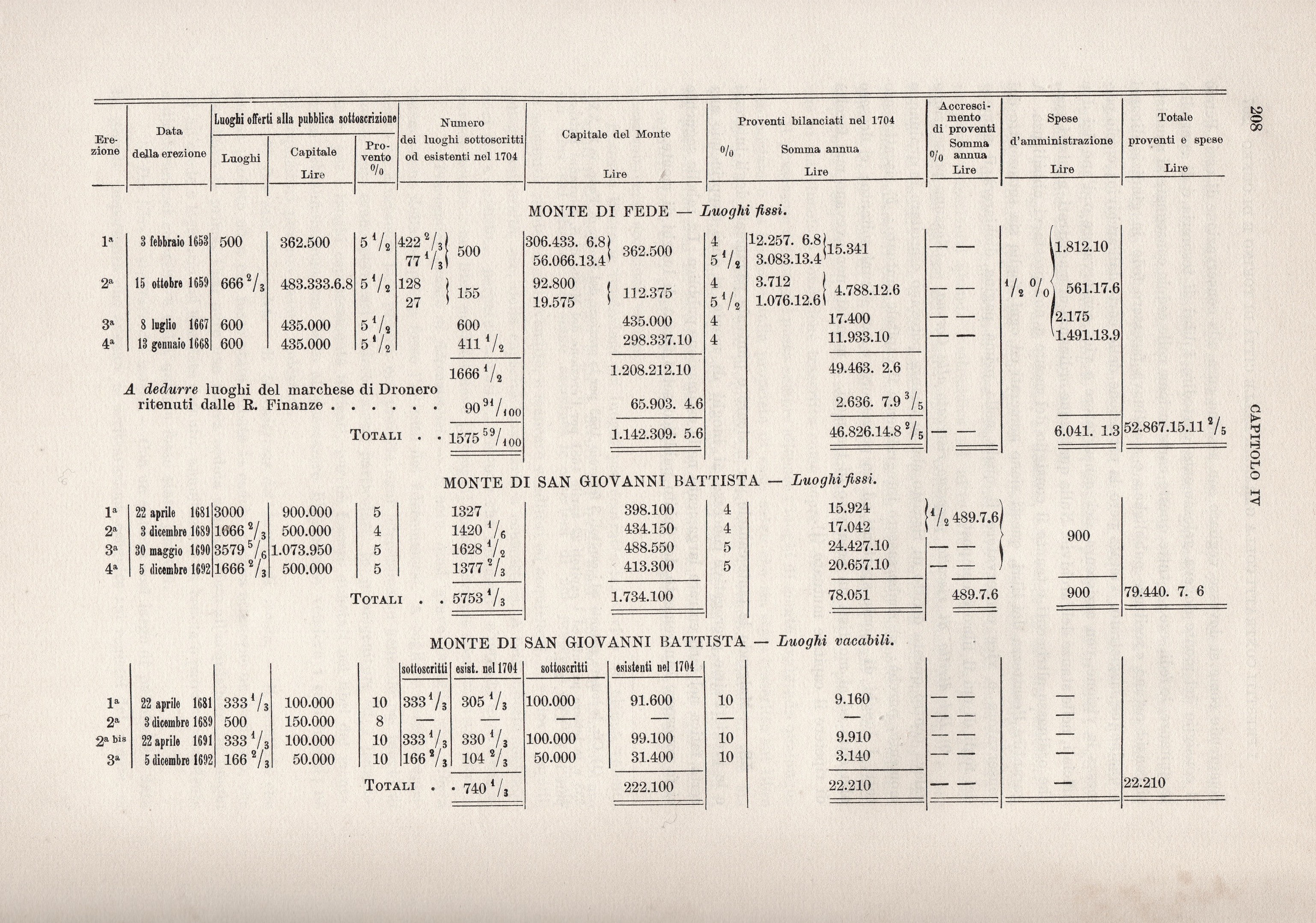 Dei Monti di Fede solo la prima e la terza erezione aveano avuto esito in tutto favorevole; mentre la sottoscrizione della seconda e quarta era stata più o meno al disotto del capitale offerto, malgrado che l’interesse (del 5 e mezzo per cento fosse allettatore. Dopo il 1668 non si fecero più emissioni di luoghi di fede, sia perché non fosse molto grande la fiducia dei capitalisti nelle garanzie offerte dal Monte di Pietà, sia per le elevate spese di amministrazione che ragguagliavano il mezzo per cento del capitale del debito. La città di Torino aveva credito più solido e si contentava di mitissime somme per le spese di amministrazione, le quali venivano a gravare quasi del tutto sul bilancio cittadino. Perciòa partire dai primi anni del regno di Vittorio Amedeo II furono sempre preferiti i Monti di S. Giovanni Battista. Gli anni di pace favorirono queste nuove specie di monti e per riflesso avvantaggiarono eziandio i Monti di Fede. La prima erezione di 3000 luoghi fissi di S. Giovanni Battista al 5% pel capitale di 900.000 lire, ordinata con l’editto del 22 aprile 1681, riuscì in tutto; e crescendo la fiducia pubblica, i luoghi erano stati collocati in maniera sicura.