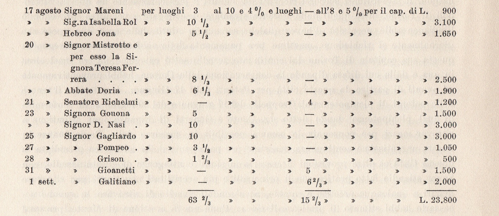[40]Dopo la liberazione si hanno appena quattro sottoscrittori: il conte Picone, che sottoscrive luoghi 33 1/3 per L. 10.000 il 20 settembre; D. Colino, che ne sottoscrive 2 (L. 600) il 23; il signor Crosetto 5 (L. 1500) il 24; e la signora Galarata di luogo (L. 200) il 25 settembre. Poi più nulla, sino alla nuova apertura.