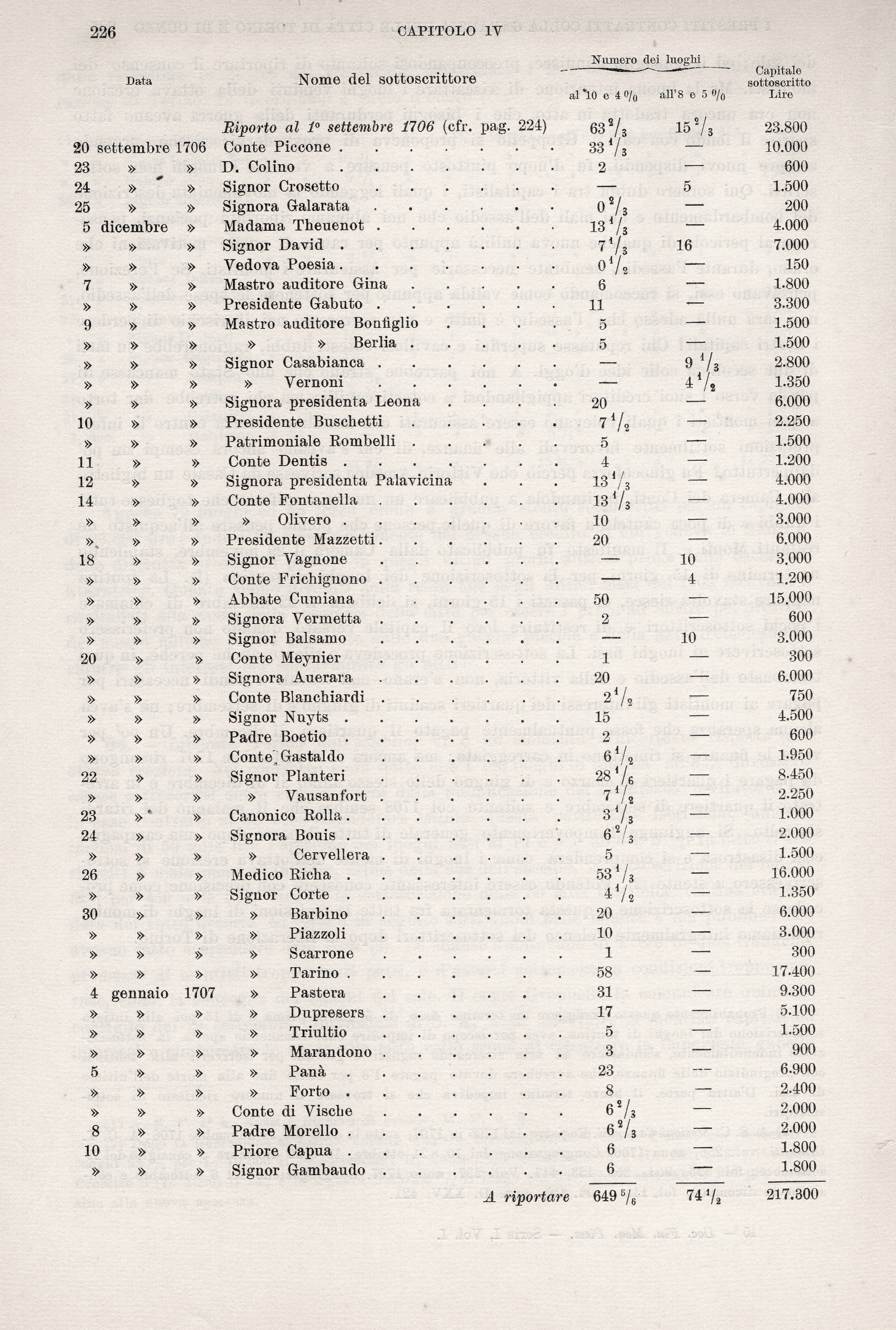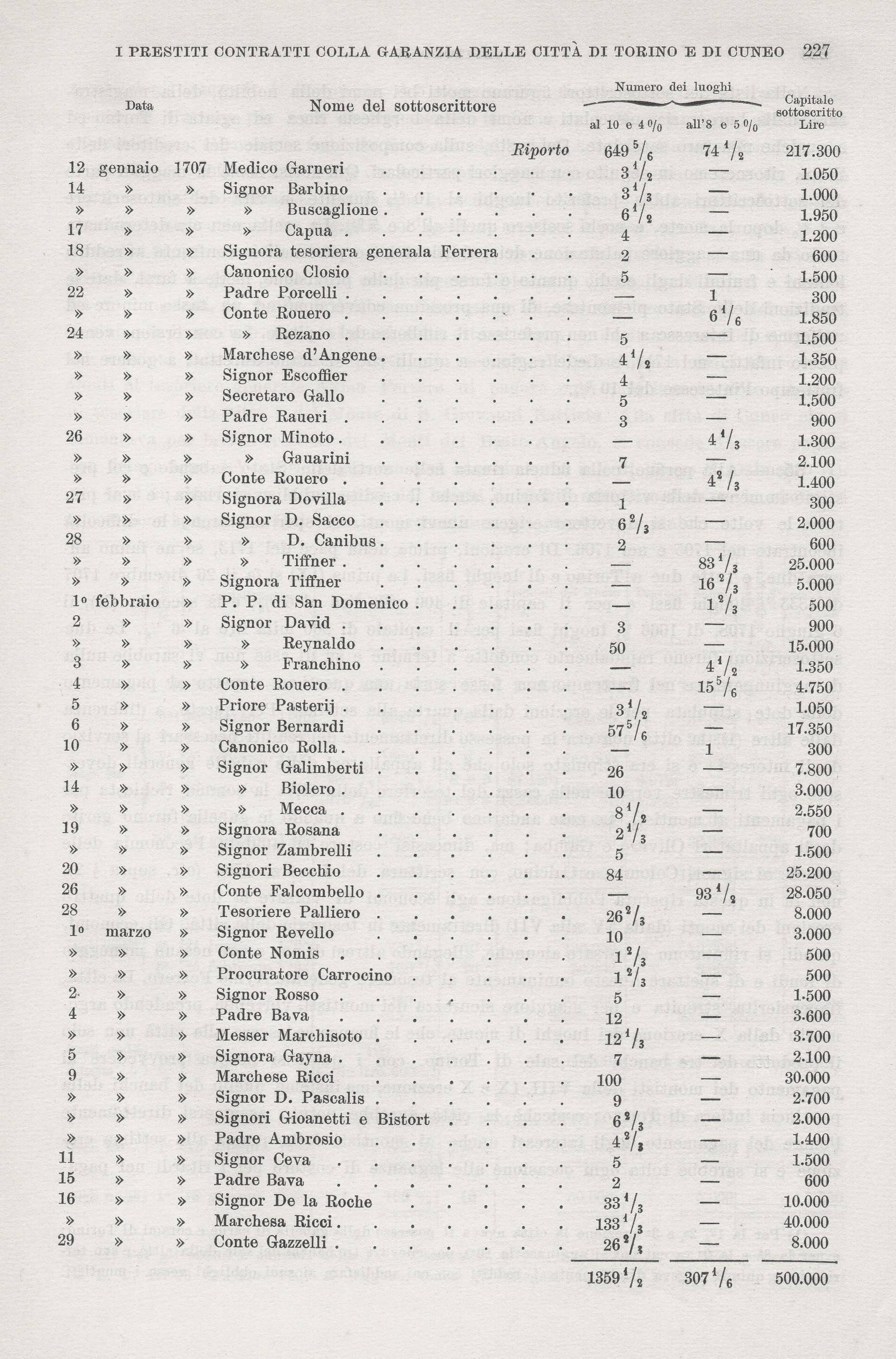 Nella lista dei sottoscrittori figurano molti bei nomi della nobiltà, della magistratura, della burocrazia, mescolati a nomi della borghesia ricca ed agiata di Torino ed a qualche non raro sacerdote. Del resto, sulla composizione sociale dei creditori dello Stato, ritorneremo in seguito con maggiori particolari. Qui notisi come la maggior parte dei sottoscrittori abbia preferito luoghi al 10% durante la vita del sottoscrittore e 4% dopo la morte, e pochi scelsero quelli all’8 e 5 per cento. La scelta non era determinata tanto da una maggiore valutazione dei redditi vicini e personali in confronto ai redditi lontani e fruibili dagli eredi, quanto e forse più dalla previsione, facile a farsi, date le tradizioni dello Stato piemontese, di una prossima conversione ad un tasso minore ed uniforme di interesse a chi non preferisse il rimborso del capitale. La conversione venne presto infatti, nel 1711, e diede ragione a quelli che si erano affrettati a godere nel frattempo l’interesse del 10 per cento.