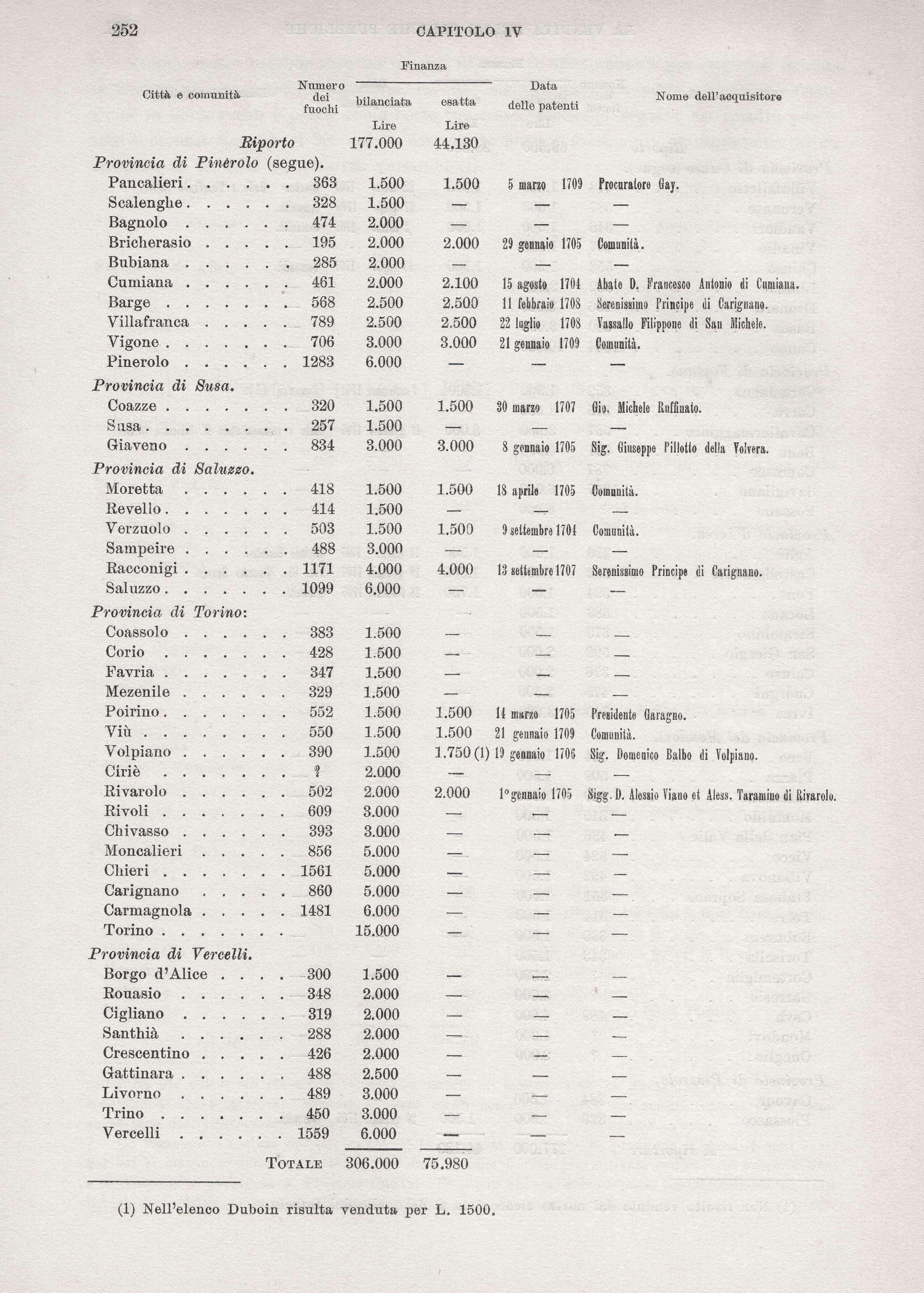 [8]Rimangono escluse dal nostro elenco le comunità di Bayro in provincia d’Ivrea (fuochi 144), per cui si ottennero dalla comunità L. 2000 invece delle L. 750 preventivate (patenti 18 aprile 1705), e di Volvera in provincia di Pinerolo (fuochi 213), par cui si ebbero pure dalla comunità L. 1510 invece di L. 1250 (17 novembre 1705).