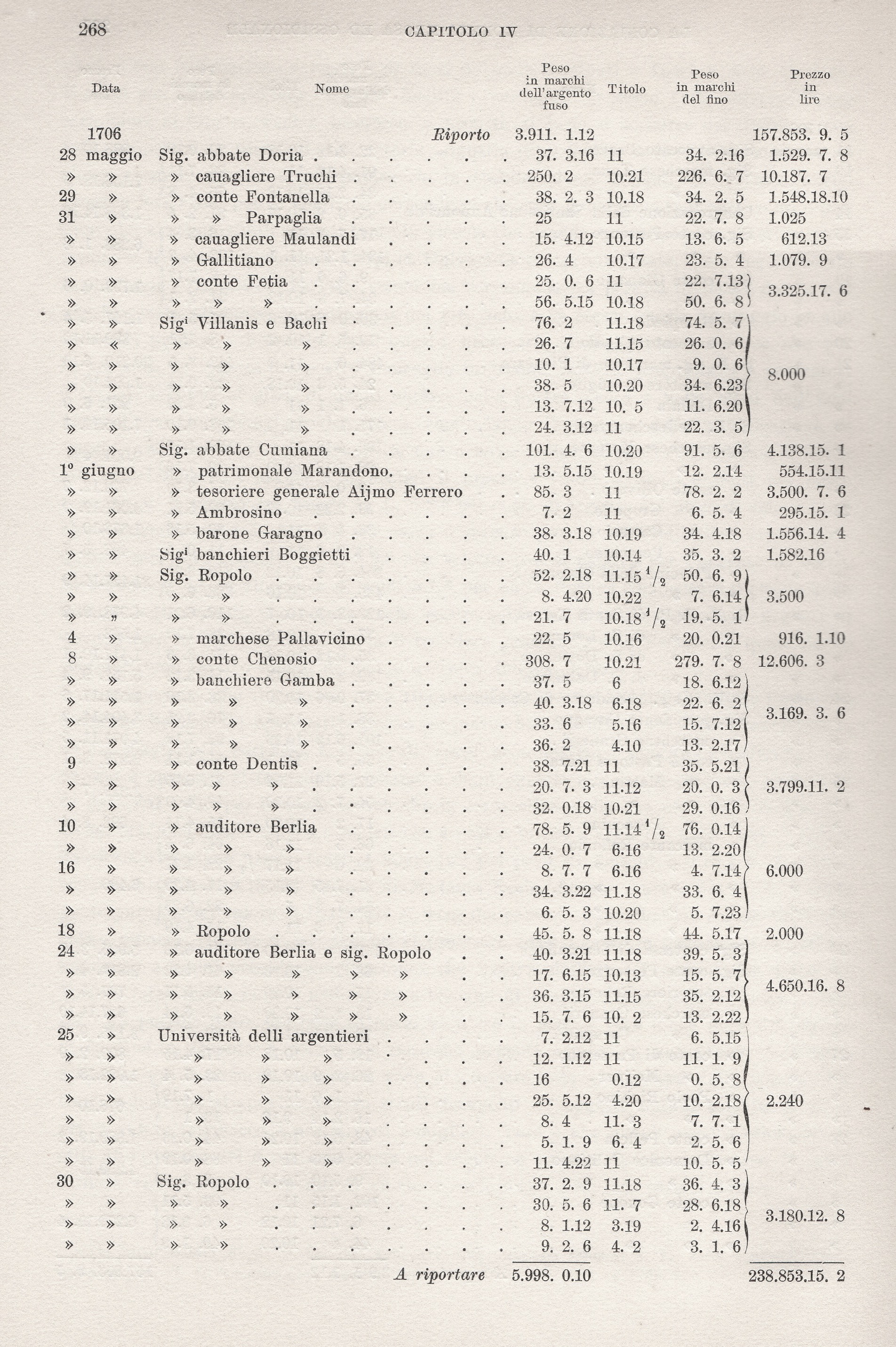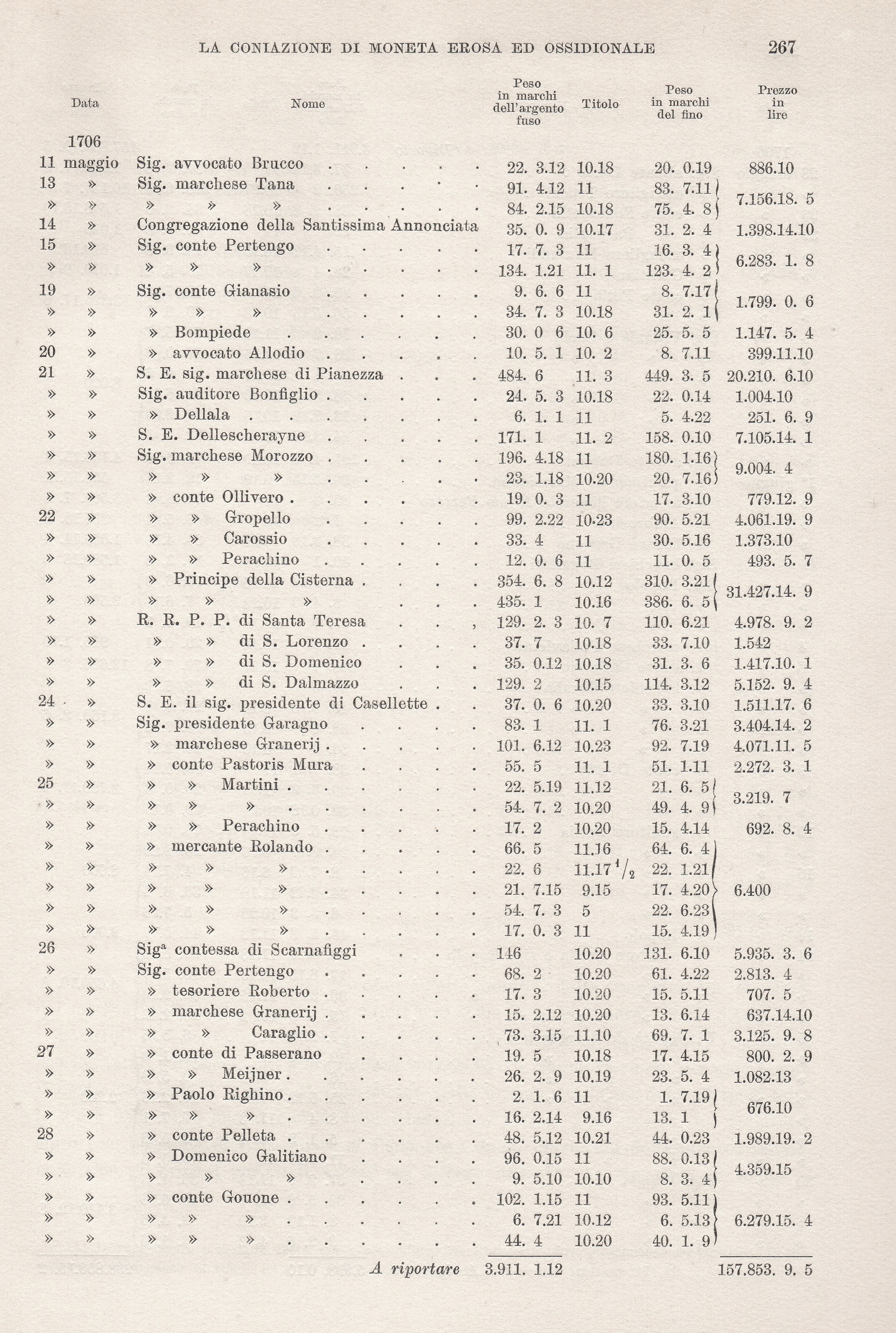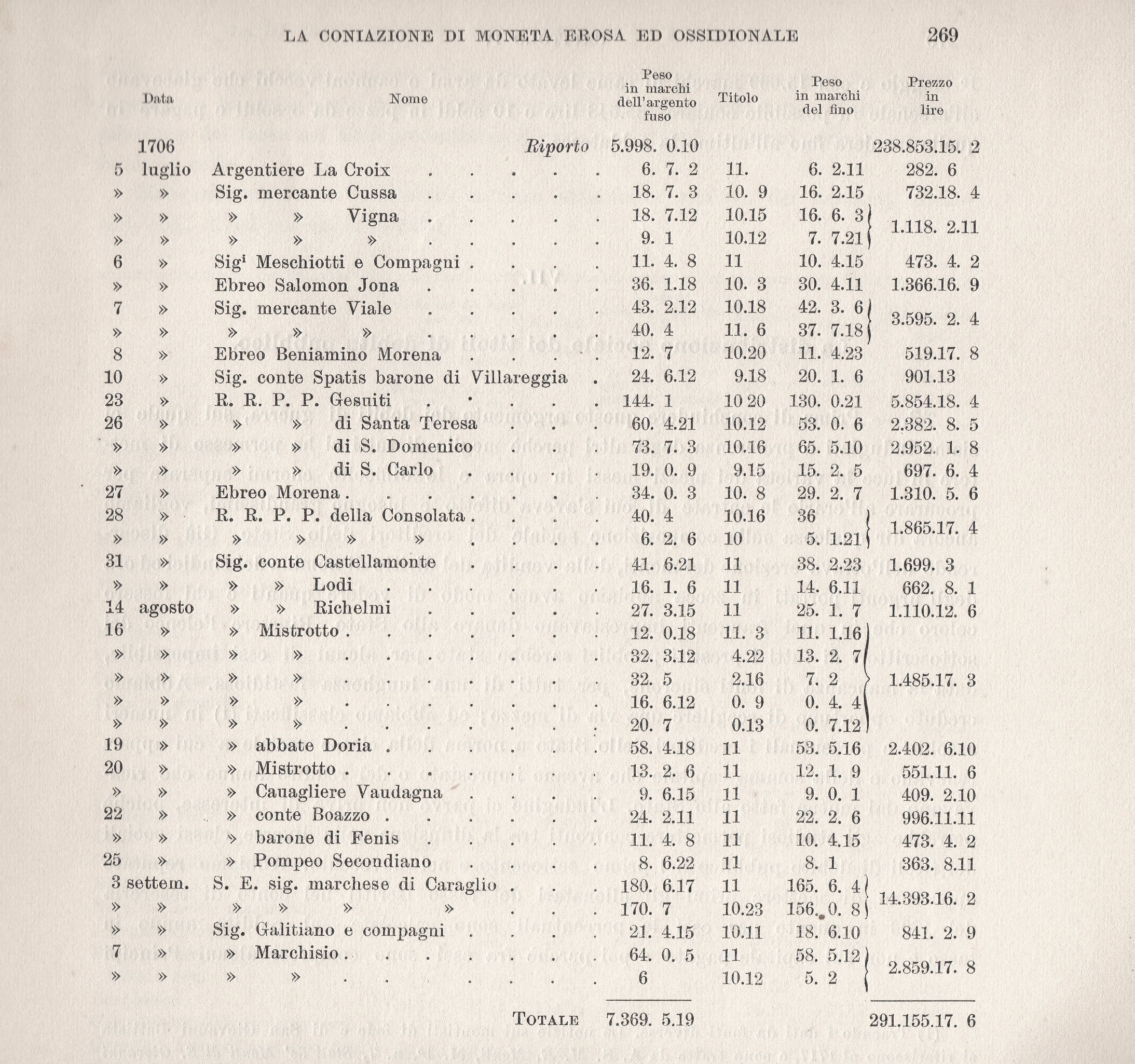 senza contare L. 114.940 coniate per conto dei banchieri Colomba e Calcino nel 1711.Il tenuissimo scarto fra il costo del fino e il corso della lira spiega come il fisco fosse assai poco tenero di una coniazione che a stento copriva le spese[4].