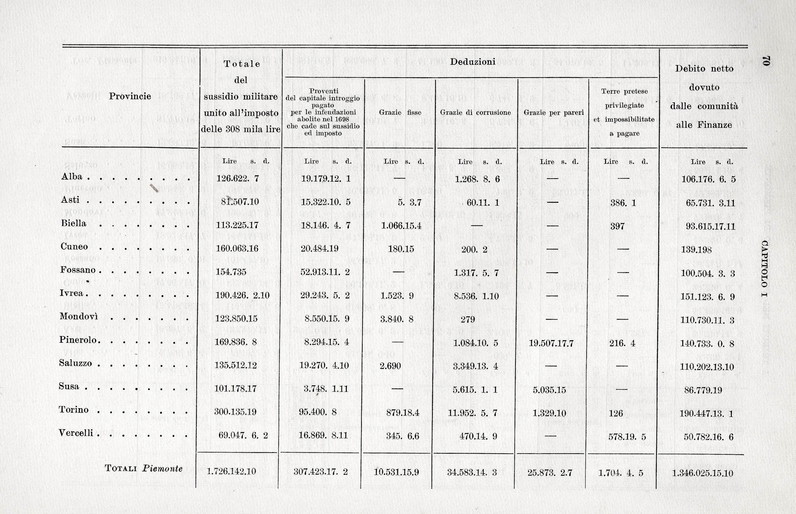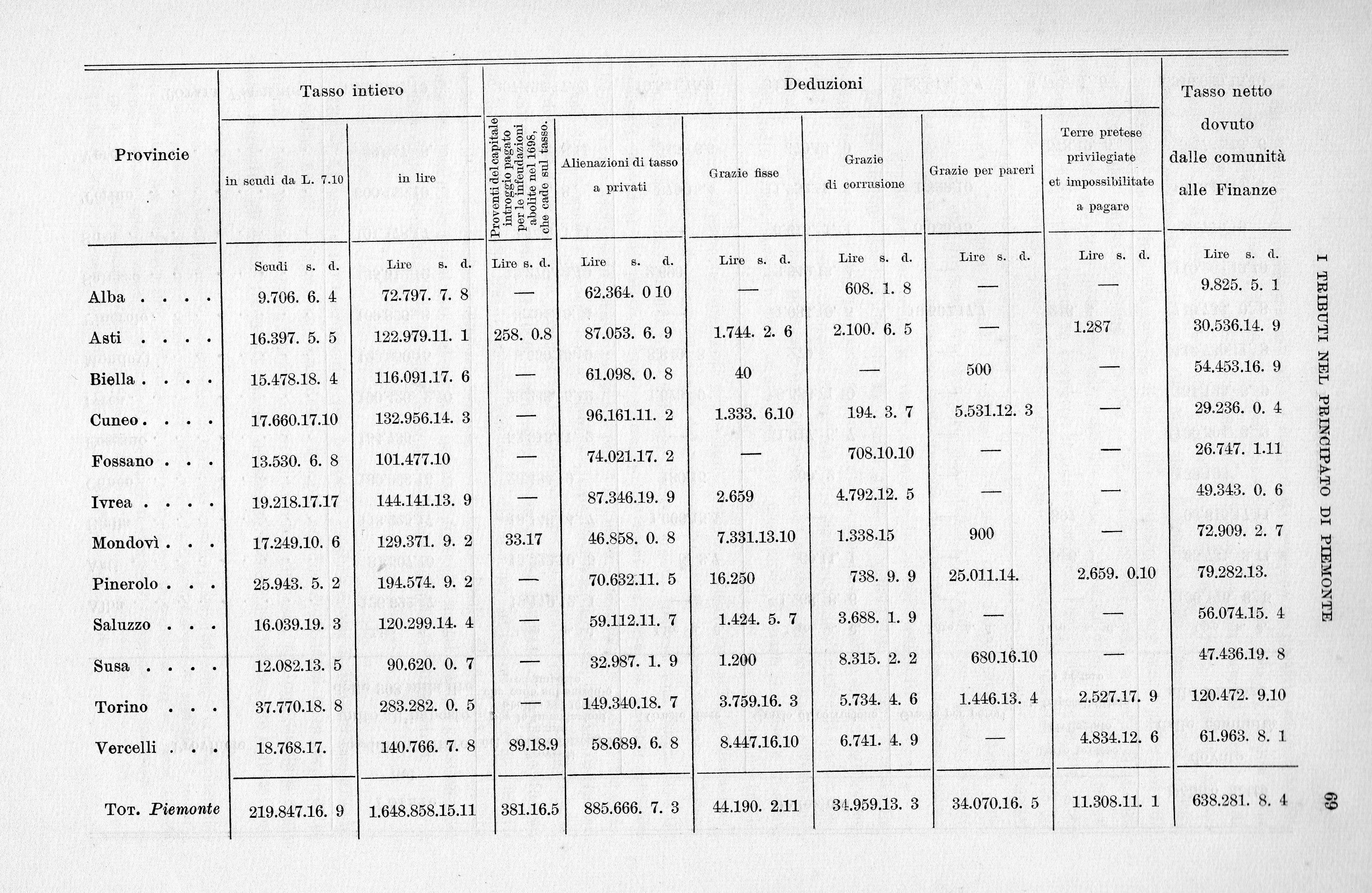 [58]Cfr. in Einaudi, B. e C. T. 1700-713, Tabelle da IV a VI, le cifre contenute nella categoria: Alienatione Demanio.
