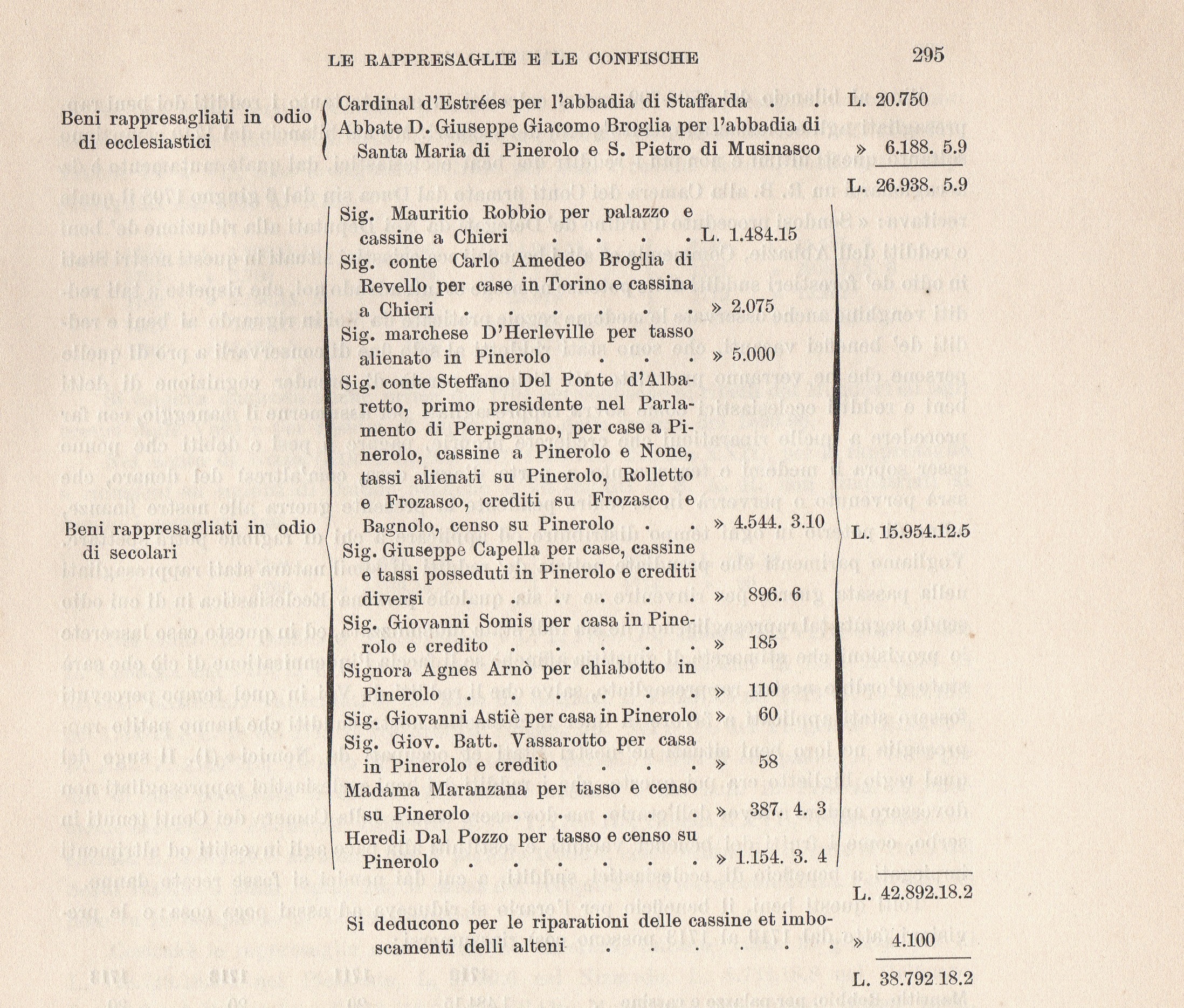 Non era una somma cospicua, e componevasi per intiero di redditi immobiliari o assimilati ad essi, come i tassi, i censi ed i crediti ipotecari. Salvo alcune eccezioni, quasi tutti i beni rappresagliati erano situati nel Pinerolese e volevansi con ciò colpire quei pochissimi i quali, essendo rimasti bene affetti al dominio francese, cessato appena nel 1696, eransi posti al servizio del Re Cristianissimo. Il reddito, che confiscavasi e che sopra è stato esposto, era già al netto dai tributi fin dapprima pagati all’erario piemontese e dagli interessi di debiti, censi passivi, legati e pensioni alimentarie. A cagione d’esempio, i redditi confiscati al conte Ponte d’Albaretto erano di L. 12.661.17.1, ma doveansi dedurre da questa cifra L. 3.429.17.1 per debiti a terzi, L. 450 di pensione alimentaria alla madamigella Ponte, L. 500 alla madre e figlia La Londa, L. 122.6.2 per legato ai padri cappuccini, L. 188.10 ai padri di Sant’Agostino, L. 116 ai padri gesuiti, L. 460 alla vedova Costantina, L. 100 alla vedova Peronella, L. 2718 per tributi e L. 33 per decima di vino; cosicché il reddito netto si residuava, come sopra fu riferito, a L. 4.544.3.10, se pure si riusciva dall’erario ad incassare qualcosa dopo tanti diffalchi.